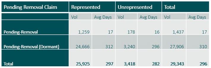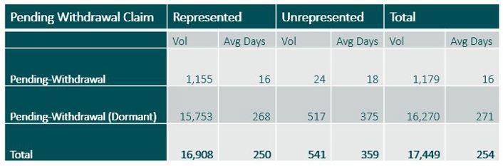 We looked at claims where the claimant/representative had requested that the compensator/TPA (third party administrator) withdraw the claim from the system. The volumes are shown below and by applying a figure of 30 days to define dormancy – a not unreasonable amount of time for this action to be concluded – we see that there are potentially 16,270 Dormant claims, waiting for the compensator to action.